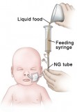 Bolus feeding using a syringe. The feeding syringe is filled with liquid food from a measuring cup.
